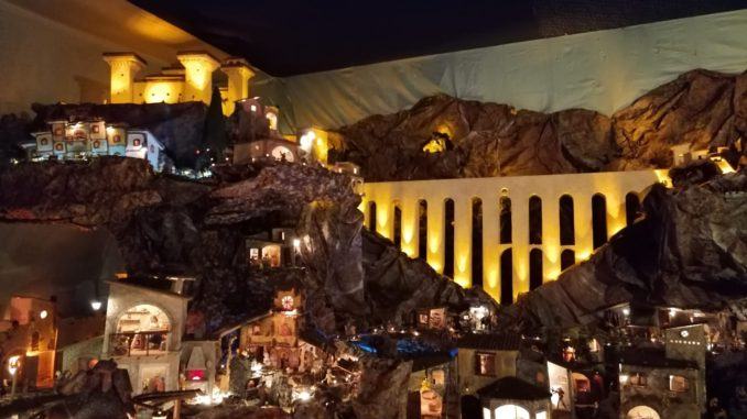 1.200 statuine, 350 effetti di animazione, più di 2.620 luci ed effetti luce per un Presepe che si dispiega su 42 metri quadri e che inserisce le scene e i personaggi della Natività in una suggestiva rappresentazione della città di Spoleto e dei suoi più riconoscibili monumenti e scorci. Una creazione monumentale per dimensioni ed impatto ma realizzata con certosina attenzione al più piccolo dettaglio. L’opera è firmata da Mauro Scarabottini e si può ammirare alla Stazione di Spoleto.