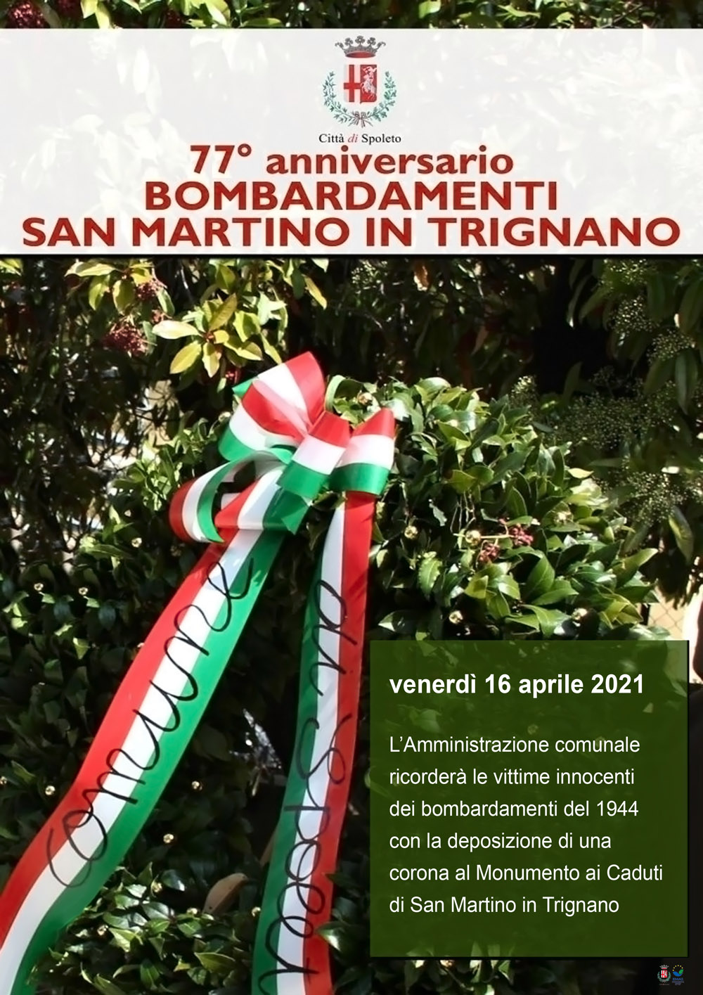 77° anniversario del bombardamento di San Martino in Trignano In occasione del 77° anniversario del bombardamento che colpì, durante la Seconda Guerra Mondiale, gli abitanti di San Martino in Trignano, il Comune di Spoleto vuole ricordare le vittime della tragedia avvenuta iI 16 aprile del 1944.
