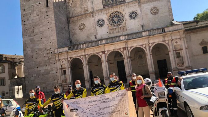 Ad accogliere Giorgio, che insieme agli amici Federico, Lorenzo, Marco e Massimiliano ha percorso circa 700 km in e-bike lungo le strade dell’Umbria dal 1 al 9 maggio, la dirigente del Comune di Spoleto Dina Bugiantelli insieme alla Polizia Municipale e all’associazione Volontari Carabinieri in Congedo Spoleto.