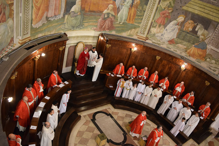 “Ti celebriamo, martire santo, che offristi a Cristo la tua vita, nei tormenti fosti vincitore, della fede testimone; nel dubbio che tormenta il cuore ci sia sostegno la tua fede: la tua intercessione sia nostro conforto”. Giovedì 14 gennaio nell’antica e maestosa Cattedrale di Spoleto, nel corso del solenne pontificale presieduto dall’arcivescovo Renato Boccardo, sono risuonate ancora una volta queste parole dell’inno a S. Ponziano, felice cavaliere del cielo, valoroso martire di Dio, patrono della Città di Spoleto e dell’intera archidiocesi di Spoleto-Norcia. Davvero in tanti gli spoletini che in Duomo, insieme al Vescovo e ai preti della Diocesi, si sono affidati alla protezione del Santo decapitato nel 175 d.c. (aveva solo 18 anni) per non aver rinnegato la fede in Cristo. Al giudice Fabiano che gli chiese quale fosse il suo nome, rispose: “Ponziano è il nome che i miei genitori mi hanno dato, ma più di ogni altra cosa desidero essere chiamato cristiano”. «Il nostro patrono – ha detto l’Arcivescovo nell’omelia – si è trovato di fronte il paganesimo romano nelle sue sopravvivenze residue, con i suoi godimenti disperati, le sue frenesie e la sua sottile tristezza. Nella romanità estenuata di quel tempo, le virtù che avevano portato l’Urbe al dominio del mondo intero erano poco più che un ricordo.