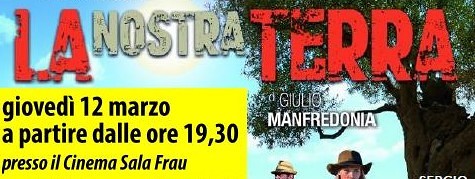 Segue (ore 20.15) la proiezione del film “La nostra terra” con Stefano Accorsi e Sergio Rubini, che racconta il lavoro quotidiano di una cooperativa agricola su un terreno tolto ai boss in Puglia (qui il trailer del film: http://www.youtube.com/watch?v=BjtmK_kLDC8). Introduce al film il regista Marco Valerio Carrara. Intervengono il sindaco del Comune di Spoleto Fabrizio Cardarelli e il coordinatore regionale di Libera Umbria Walter Cardinali. Partecipa il capitano della compagnia dei Carabinieri di Spoleto Marco Belilli.