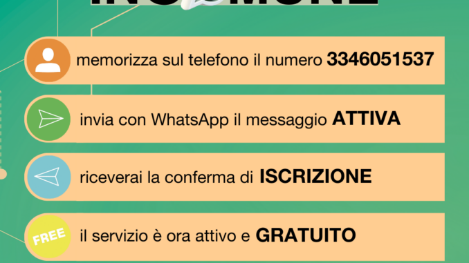 Per iscriversi al servizio è sufficiente scaricare l’applicazione WhatsApp, inserire tra i propri contatti il numero 3346051537 ed inviare un messaggio scrivendo “ATTIVA” (allo stesso modo per cancellarsi inviare un messaggio con “Cancellami”).