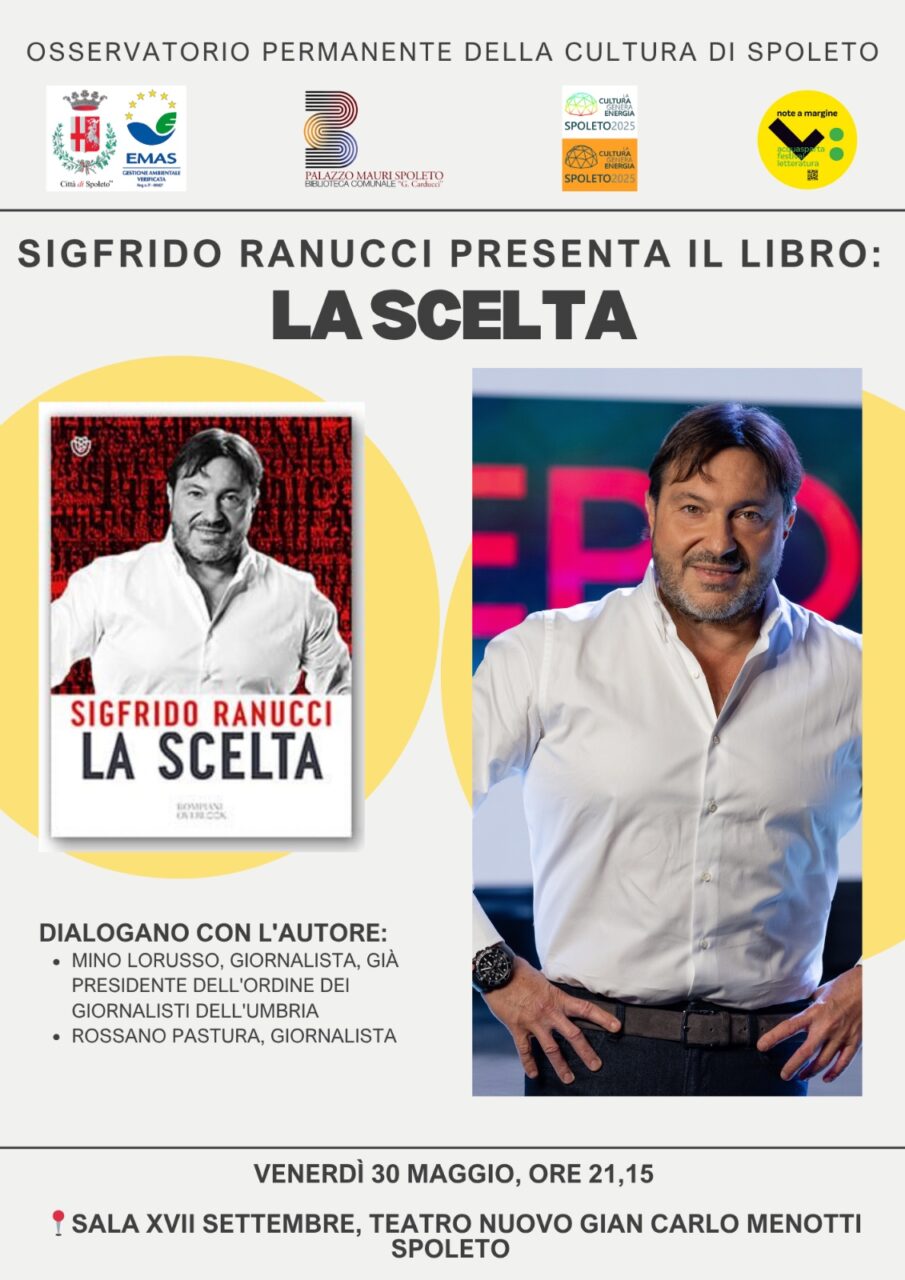 Sigfrido Ranucci, volto e mente del programma Report, salirà sul palco del Teatro Nuovo G. Menotti venerdì 30 maggio, alle ore 21,15, per presentare il suo ultimo libro ’La scelta’.