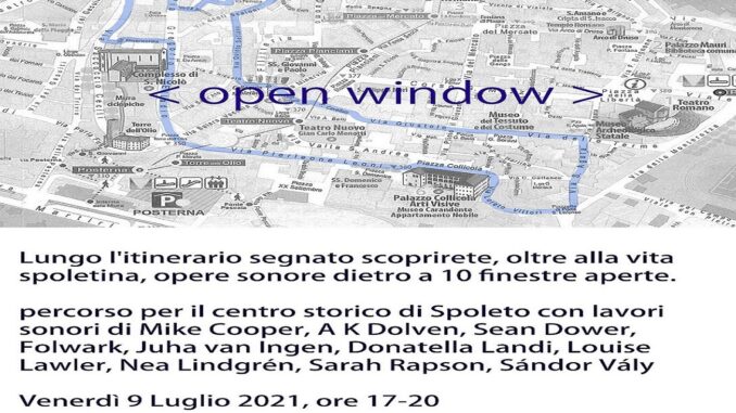 Venerdì 9 luglio dalle 17 alle 20, nel centro storico di Spoleto “Open window” propone un incontro casuale con suoni che provengono da finestre aperte lungo un itinerario per le strade e vicoli del centro storico.