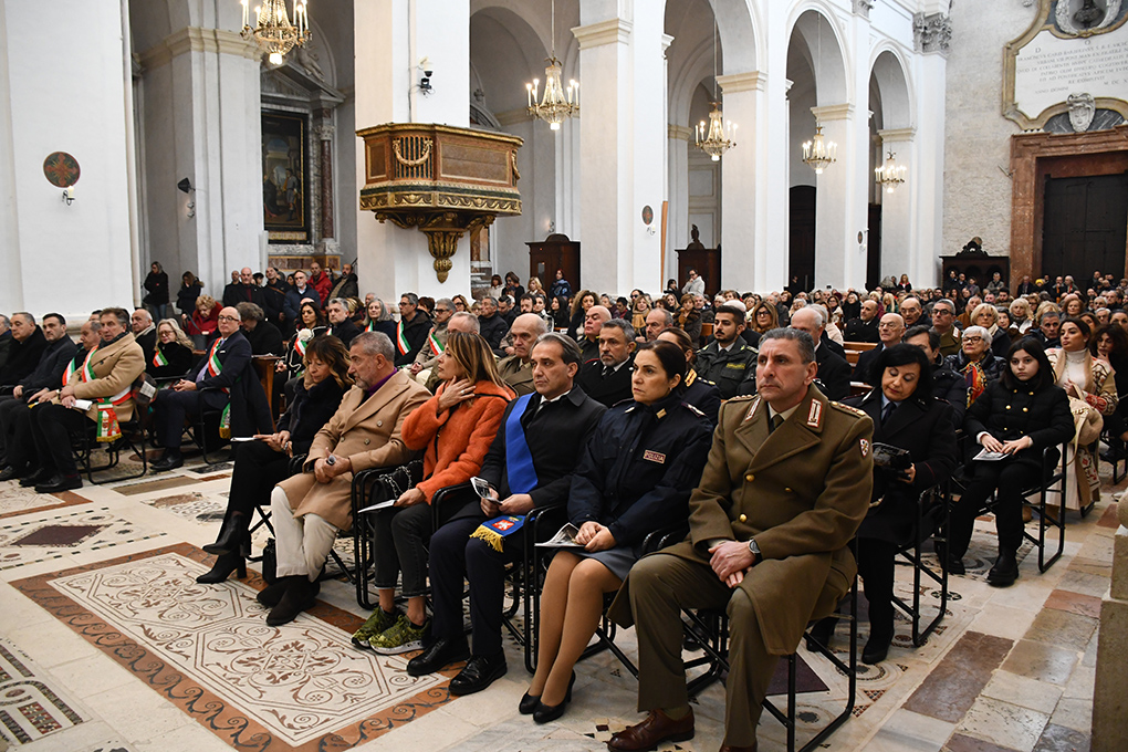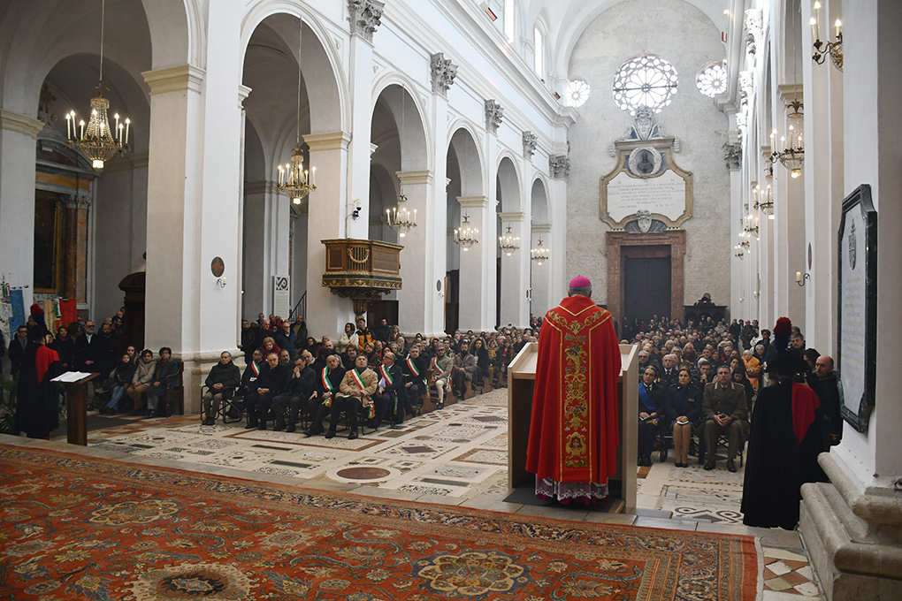 Mai come nel giorno di San Ponziano la Basilica Cattedrale diventa la casa di tutti gli spoletini. Qui accogliamo Gesù e scopriamo che in realtà è Lui ad accogliere noi. Gesù si fa ospite nelle nostre povere vite per ospitarci nel suo cuore. Noi gli abbiamo costruito un edificio magnifico, lui ha costruito per noi un Regno. Noi gli diciamo le nostre parole di ansia e di sofferenza, Lui ci dice la sua parola di pace e di amore. Noi gli offriamo spesso il superfluo e ci ricordiamo di Lui quando siamo in difficoltà, Lui ci dona instancabilmente tutto se stesso, non si stanca di venirci a cercare finché non ci trova o ci aspetta ansioso non per giudicarci ma per avvolgerci con l’abbraccio della sua misericordia. Rivolgo un cordiale benvenuto e un saluto di pace e di benedizione a tutti voi cittadini e amici di Spoleto, che riconoscete nel Patrono un esempio di vita e un intercessore potente. E saluto e ringrazio le Autorità civili e militari, iniziando dalla Signora Presidente della Giunta Regionale: la loro partecipazione a questo solenne evento ecclesiale ci onora e ci conferma nel proposito di unire le forze per il servizio delle comunità affidate alle nostre cure. Abbiamo appena ascoltato parole esigenti: «Se qualcuno vuol venire dietro a me rinneghi se stesso, prenda la sua croce e mi segua». Rinnegare se stessi non significa denigrare ciò che si è né rifiutarlo, ma rendersi liberi anche da se stessi, liberi da pensieri che a volte ci schiacciano, da logiche chiuse nell’io, da catene che imprigionano. Certo, la croce non affascina nessuno, anzi impaurisce tutti. È Gesù che affascina e suscita il desiderio di seguirlo (cf Gv 1, 35-39). “Comprendere” Gesù – nel senso originario di prenderlo con sé fino a possedere il suo segreto – è possibile solo se la sua vita ci ha “afferrato” e poniamo i nostri passi sui suoi passi, rinnoviamo le sue scelte, preferiamo coloro che lui preferiva, spendiamo la vita per qualcosa che conti più dei nostri interessi. In una parola: chi desidera gustare la gioia che Lui ha promesso, deve camminare per la stessa via che Lui ha percorso. Per questo non fugge dinanzi alle difficoltà e accetta la fatica, sia quella che appartiene alla vita ordinaria che quella imprevista e perciò ancora più gravosa. Siamo posti continuamente dinanzi ad un bivio. Da una parte c’è la strada del “benessere individuale”: tante persone ne fanno la cornice ideale a partire dalla quale compiere tutte le altre scelte. Si tratta però di una dolce e ingannevole illusione: chi s’incammina per questa via prima o poi si troverà vuoto e solo. Non dimentichiamo il severo ammonimento del Vangelo: «Chi vuole salvare la propria vita, la perderà» (Mt 16, 25). C’è, però, anche un’altra strada: chi sceglie il Regno di Dio si impegna a rendere più bella la vita, non solo la sua, ma anche quella degli altri, e accoglie il compito di accompagnare e sostenere il cammino di tutti. È chi vive nella consapevolezza che la vita si guadagna donandola, si ottiene spendendola, si conquista affidandola. Confrontandoci con la coerenza e il coraggio mostrati da Ponziano nel suo martirio, dobbiamo umilmente riconoscere che i meccanismi perversi del tempo che viviamo ci stanno conducendo, quasi inavvertitamente, a rimuovere dal nostro universo l’idea del limite e della fragilità, nonostante che la ancora recente pandemia e la funesta follia delle guerre non cessino di riproporcelo in modo prepotente e tragico. E dunque pensiamo di poter vivere senza affrontare le questioni fondamentali del perché della vita e della morte, del senso della sofferenza e della capacità di sopportarla, della gioia per la quale l’uomo è fatto, della sua sete di infinito e di bellezza, della sua libertà che va sempre coniugata con la responsabilità; non ci preoccupiamo di capire cosa nasconda il bisogno di prossimità e di leggerezza, di una relazione verace e trasparente e, al tempo stesso, il bisogno di silenzio e di solitudine, senza pròtesi e connessioni; così come non sappiamo scoprire quanto abbiamo in cuore, attenti a ciò che lo può infettare contagiando i rapporti…Ma tutto quanto tentiamo senza sosta di rimuovere si ripresenta continuamente sotto forma di domande, inquietudini, nostalgie, riscoperta di qualcosa che sembrava scontato o al contrario eliminato per sempre, esigenze mai prima avvertite, desiderio nuovo di relazioni, ricerca di un fondamento sicuro, capace di dare senso a tutto. Siamo così inevitabilmente ricondotti a noi stessi, per non continuare a mentirci e farci del male, ignorando le domande che contano. È una situazione che può dischiudere un “tempo opportuno”, un’occasione propizia per ritrovare la strada. Ma perché questo sia possibile bisogna in qualche modo ritornare all’origine, alla fonte, entrare nel silenzio e porsi in ascolto di una parola carica di promessa, anche se scomoda e tagliente, come quella che abbiamo ascoltato nella pagina evangelica e che la testimonianza di Ponziano ci ripropone: «Quale vantaggio avrà un uomo se guadagnerà il mondo intero, ma perderà la propria vita? O che cosa un uomo potrà dare in cambio della propria vita?». Accogliamo allora dal nostro Patrono l’invito a “ripartire da Dio” e dalla sua sapienza, come abbiamo ascoltato nella prima lettura (Sir 51, 13-22). Ripartire da Dio vuol dire vivere in prima persona e contagiare altri dell’inquietudine di una ricerca costante del suo Volto (cf Sal 27, 8), vuol dire denunciare la miopia dell’uomo che si contenta degli idoli che si costruisce con le proprie mani e ai quali è disposto a sacrificare anche i beni più preziosi. Perché Dio, che «è più grande del nostro cuore» (1 Gv 3, 20), è nel silenzio che ci turba davanti alla morte e alla fine di ogni grandezza umana, è nel bisogno di giustizia e di amore che ci portiamo dentro, è il Mistero santo che viene a colmare la nostalgia del bello, del buono, del giusto e del vero ch
