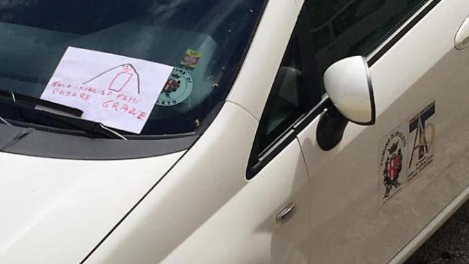 IL FATTO: Un’auto del Comune di Spoleto blocca la rampa per l’accesso dei disabili al polo sanitario di San Carlo. E un ragazzino in carrozzina lascia un disegno sul parabrezza: “Sono invalido, lasciami passare grazie”.