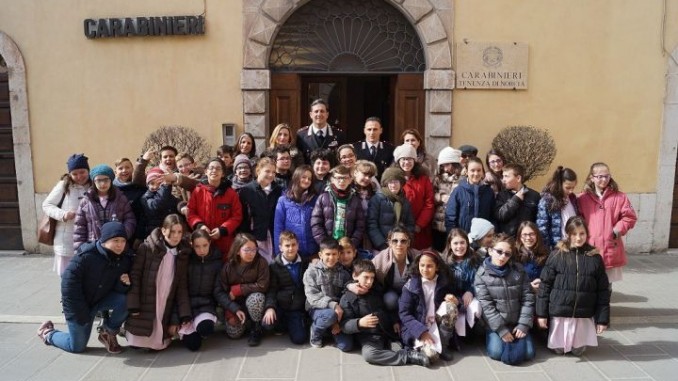 NORCIA – In seno al Protocollo d’Intesa tra l’Arma dei Carabinieri ed il Ministero dell’Istruzione ed in riferimento alle numerose iniziative di legalità a favore degli studenti, questa mattina circa 40 alunni di quinta elementare della Scuola di Norcia, accompagnati dalle maestre, hanno effettuato una visita alla locale caserma dei Carabinieri. A fare gli onori di casa il Comandante Ten. Enrico Alfano ed i suoi collaboratori, che hanno voluto far vedere da vicino i mezzi di servizio, l’equipaggiamento e le apparecchiature tecnologiche, sulle quali i ragazzi hanno mostrato rilevante interesse. Hanno inoltre assistito a lezioni teoriche su come si interviene sulla scena del crimine e si sono sottoposti alla prova di rilevamento delle impronte: un alunno ha addirittura provato l’ebrezza della foto segnaletica. Dopo un interessante dibattito, a tutti i giovani visitatori sono stati offerti dolci e cioccolatini a ricordo di questa indimenticabile giornata. A nome della Dirigente Scolastica dott.ssa Rosella Tonti, le maestre hanno voluto ringraziare l’Arma dei Carabinieri ed i suoi componenti per l’incontro e la disponibilità offerta